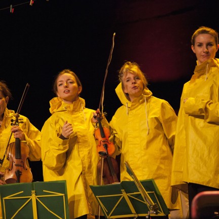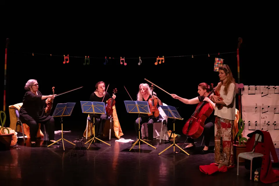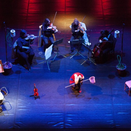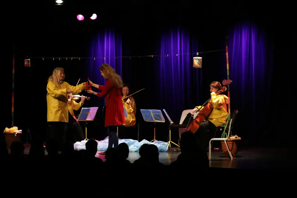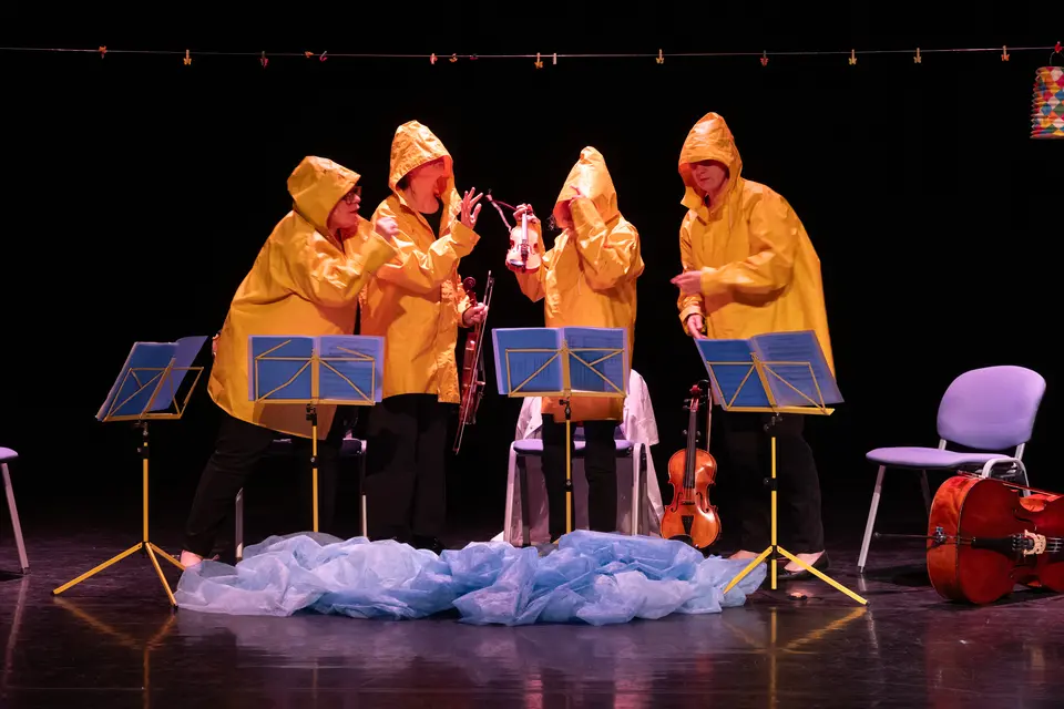 Quatre étranges personnages pêchent patiemment sur la rive d’un lac. Soudain jaillit de l’eau : un violon.